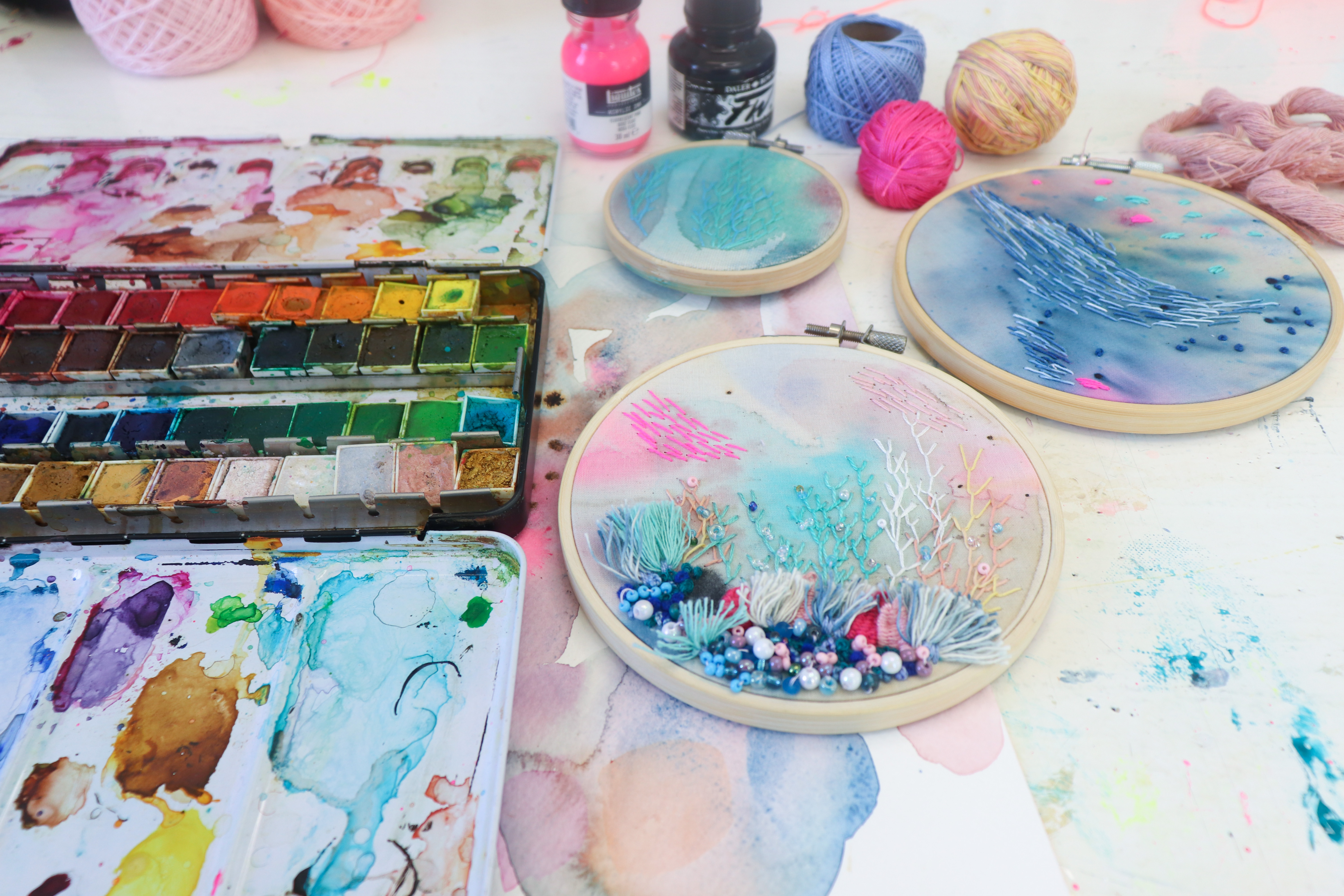 Minimum essentials: watercolors or acrylic inks, watercolor paper for practice, 1-2 fabric pieces (cotton or linen), embroidery floss (DMC or similar), embroidery needles, one embroidery hoop (any size), scissors, water jar, and brushes.