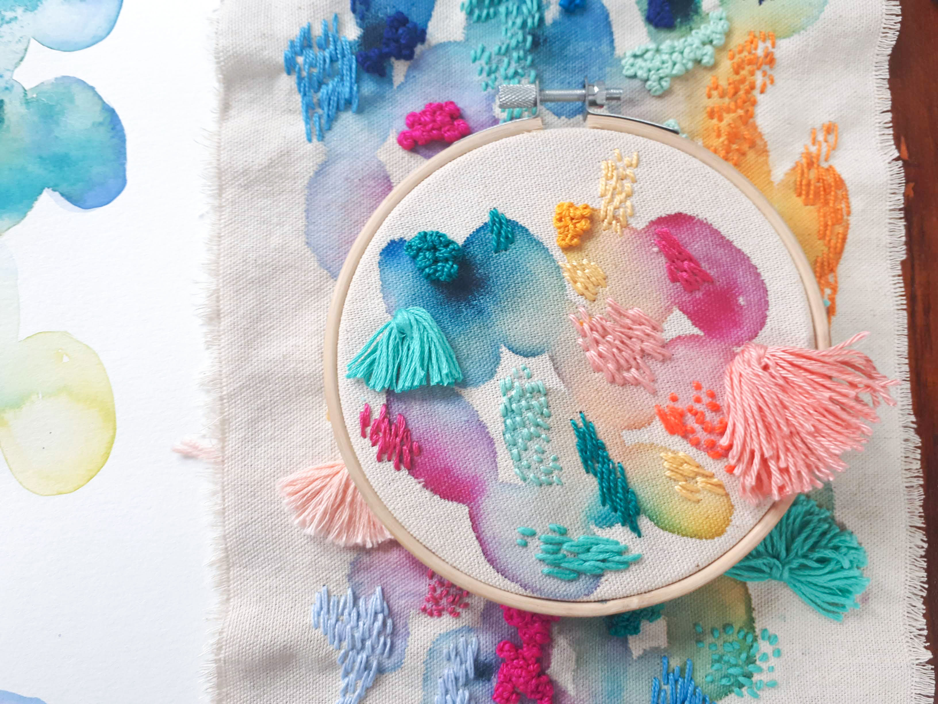 Discover paint and embroidery in this free guide! Includes a creative exercise, tips on watercolor and stitches, and inspiration to take your embroidery to the next level.